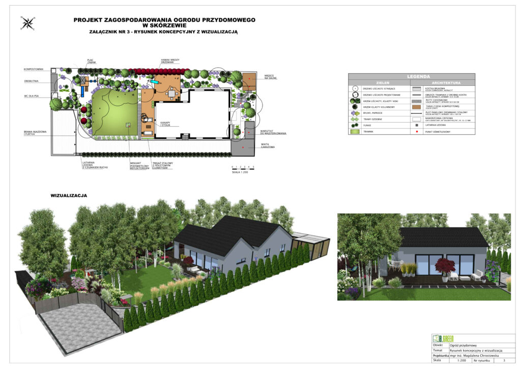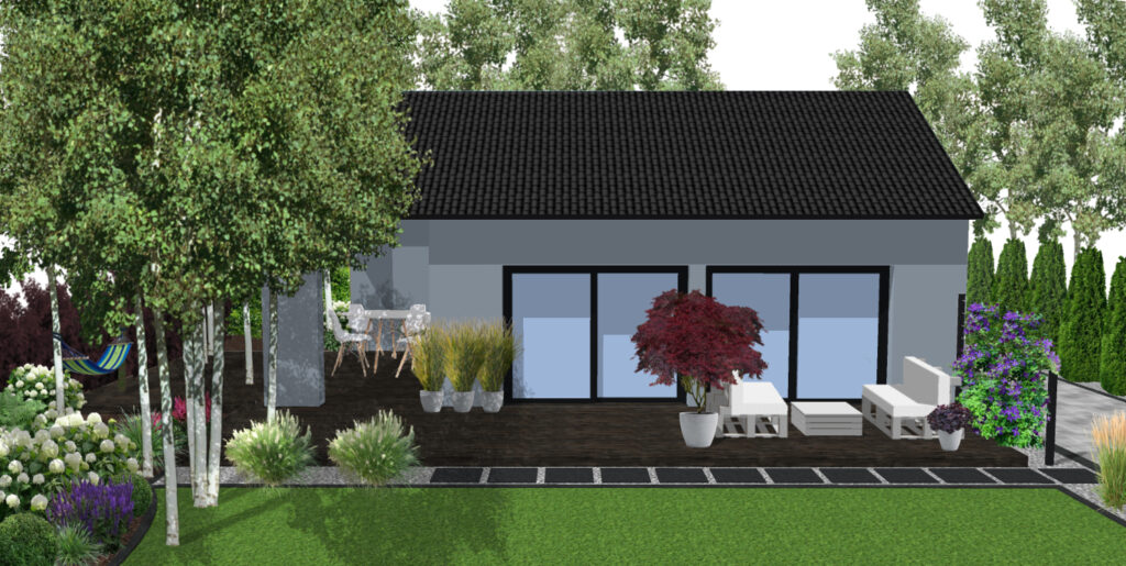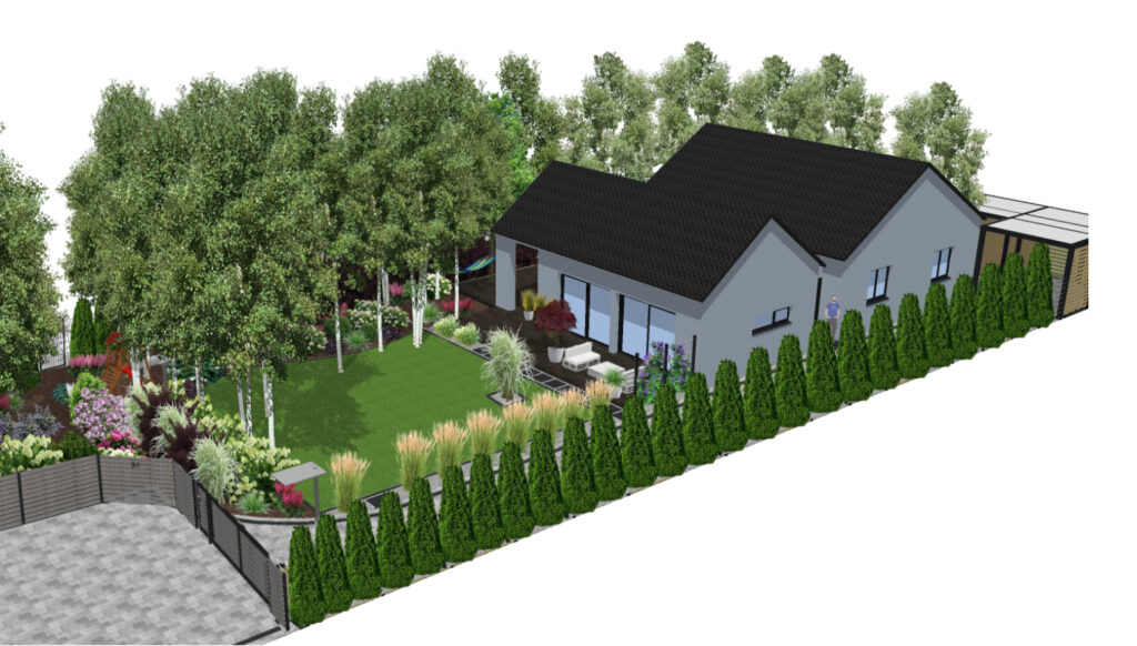 Duży ogród w Skórzewie powstał na terenie rosnącego tu wcześniej lasku. Część drzew wycięto pod budowę domu i podjazdu, jednak spora część drzewostanu została zachowana. Drzewostan składa się głównie z samosiewów brzozy brodawkowatej i topoli białej. Zbyt gęsto rosnące drzewa wymagały przerzedzenia. Sporządzono inwentaryzację i wytyczono rośliny przeznaczone do usunięcia. Pozostałe drzewa zyskały przestrzeń do zdrowego wzrostu i rozwoju, a pomiędzy nie wkomponowano barwne rabaty oraz plac zabaw dla dzieci. Wzdłuż dłuższego boku działki poprowadzono estetyczny podjazd, prowadzący do domu oraz do zaprojektowanej na końcu ogrodu nowoczesnej wiaty. Nasłonecznioną część ogrodu zajmuje spory trawnik, zaś przy budynku powstał duży taras ze słoneczną częścią wypoczynkową i zacienioną strefą jadalną.